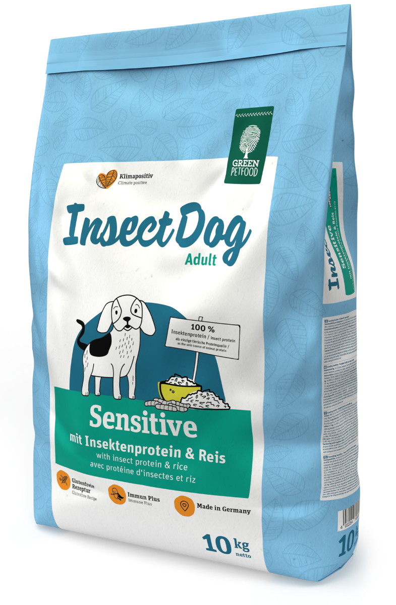 INSECTDOG SENSITIVE mit Insektenprotein & Reis Unser InsectDog Sensitive ist aufgrund der ausgesuchten Rohwaren wie Reis und Insekten sowie der schonenden Verarbeitung perfekt für sensible Hunde geeignet. Die einzigartige Kombination aus Vitalstoffen wie Vitamin E, Vitamin C, Inulin und Hefe unterstützen Haut, Fell, Darmflora und Immunsystem optimal. InsectDog Sensitive eignet sich nicht nur für empfindliche Fellnasen, sondern auch für alle vierbeinigen Pioniere:Insekten sind DIE nachhaltigen Eiweißlieferanten der Zukunft! Glutenfreie Rezeptur Diese Rezeptur enthält kein Gluten und eignet sich zur täglichen glutenfreien Ernährung gesunder und empfindlicher Hunde. Immun Plus Durch die einzigartige Kombination von wertvollen Vitalstoffen wie Vitamin E, Vitamin C, Inulin und Hefe werden Haut, Fell, Darmflora und Immunsystem optimal unterstützt. Fütterungsempfehlung:
