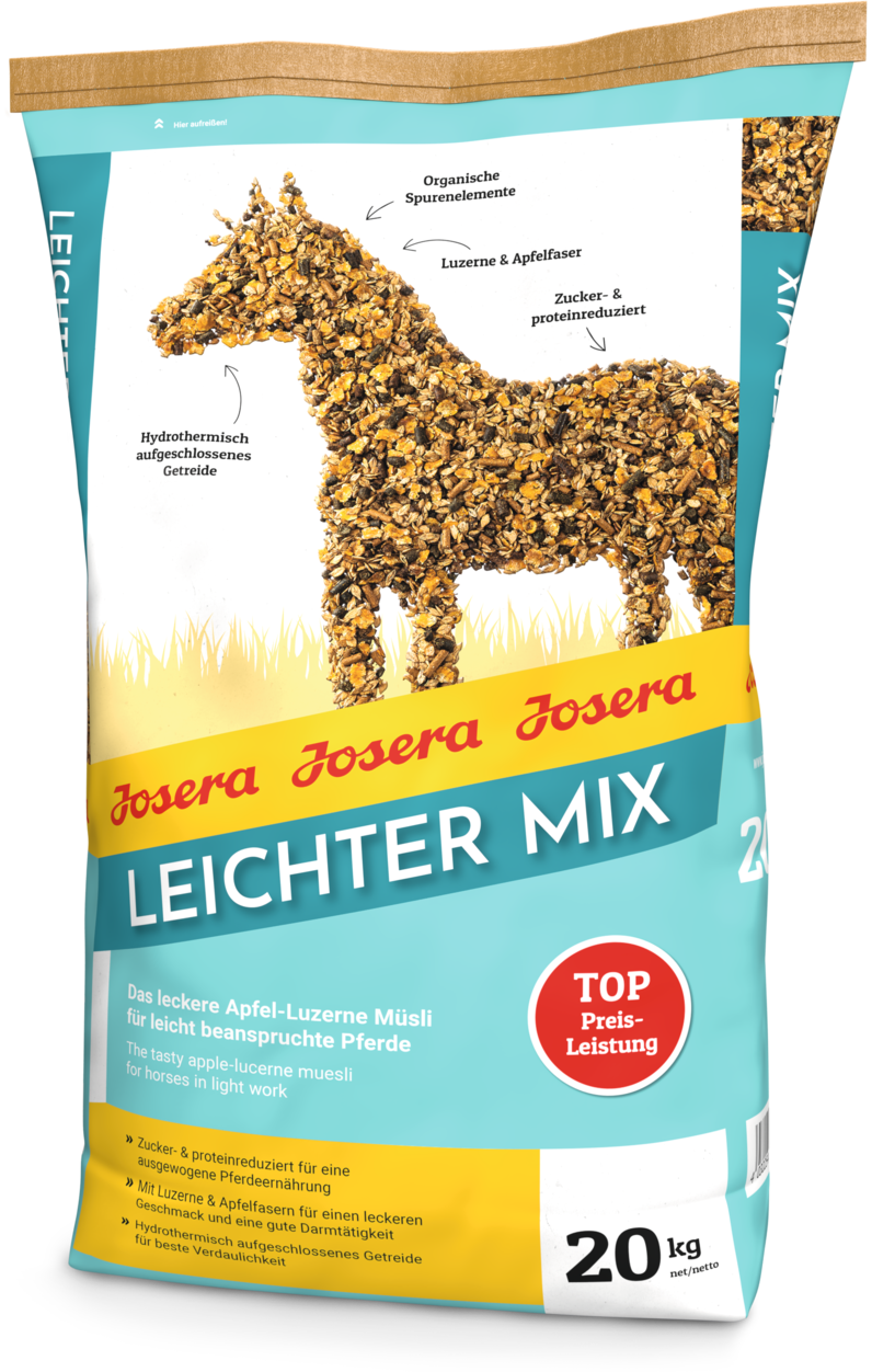 Fütterungsempfehlung: Beim Einsatz als alleiniges Krippenfutter zur Heuration: Je nach Arbeitsleistung ca. 300-500 g pro 100 kg Körpergewicht und Tag zur Deckung des Energiebedarfs. Ab einer Menge von 2 kg am Tag ist ein Großpferd mit allen Vitaminen und Mineralien ausreichend versorgt. Bei geringerer Fütterungsmenge empfehlen wir die Ergänzung mit Josera Joker Mineral oder Josera Kraut & Rüben Mineral. 1 Liter Josera Leichter Mix entspricht ca. 530 g.